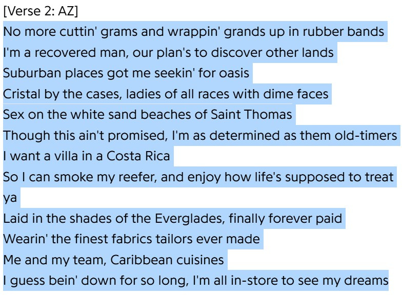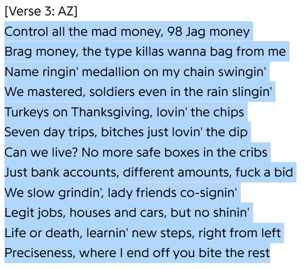 Look, I’ll listen to it all. But if a rapper is saying something, I’m more likely to gravitate to those songs. A consequence of my upbringing and surroundings. (Example) My brother used to ask 10-year-old me to lay on his back as he did push-ups (more weight, but not much, I was scrawny), while…Everywhere We Gooooo, People Wanna Knowwww, Whoooo We Are, Sooooo We Tell Them, This Is D-Block, Mighty Mighty D-Block…was blasting in the background. Can you really be shocked that The Lox is one of my favorite groups? Where were we? Back to AZ.