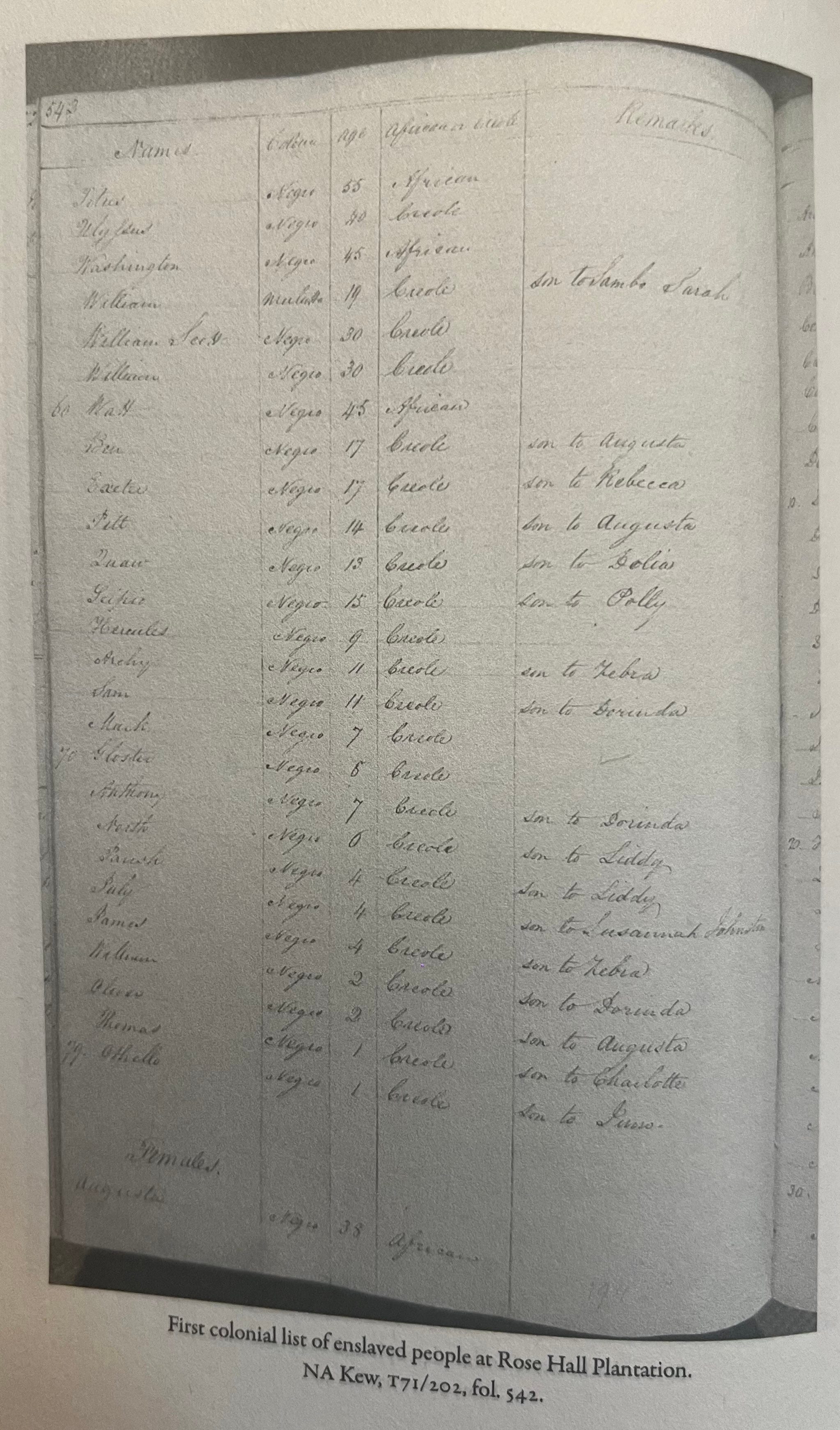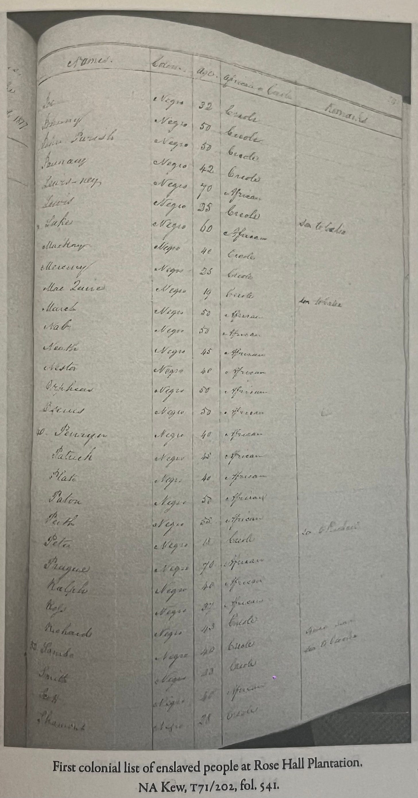 …eldest enslaved people at Rose Hall were Africans who were born in the 1740s and 1750s, lived into their sixties and seventies, and died before the abolition of slavery. Of the 152 enslaved people recorded at Rose Hall at the end of June 1817, the eldest two were seventy-year-old African-born men named Prague and Lewis-ney (listed also as Jemmy).
