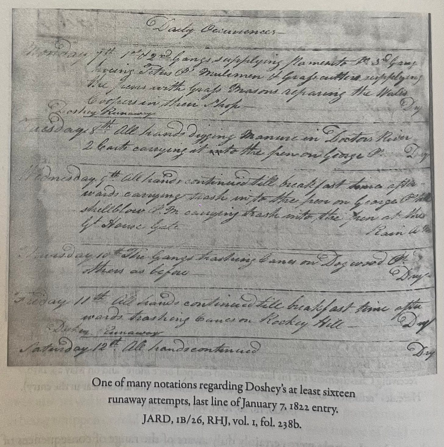 Escape, across the continuum of vanish to petit marronage, was certainly a constant in a society that tried to extract every ounce of physical from the enslaved. Between 1817 and 1832, “[a]lmost 25 percent of the total enslaved population were identified as running away from Rose Hall at least once during this time period.”