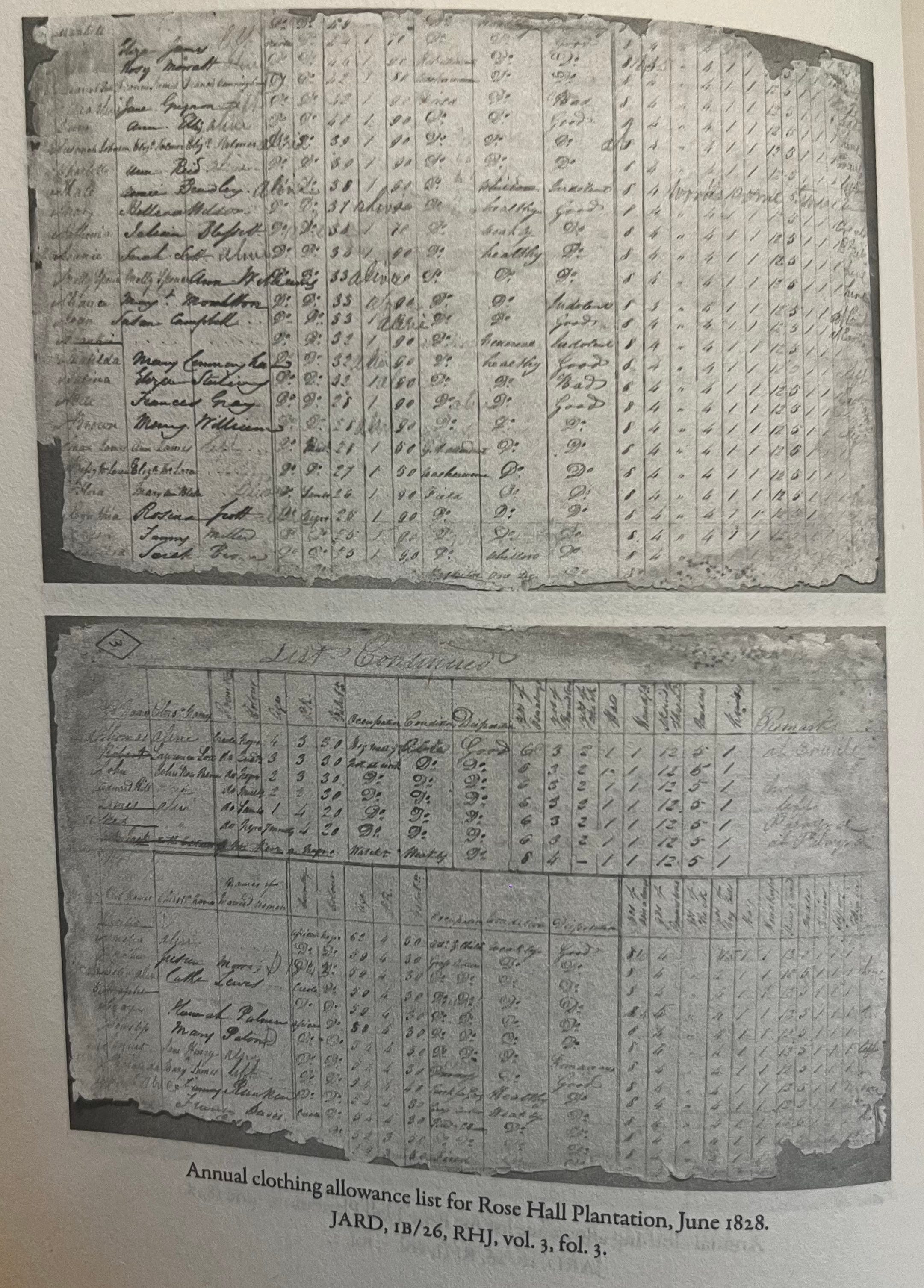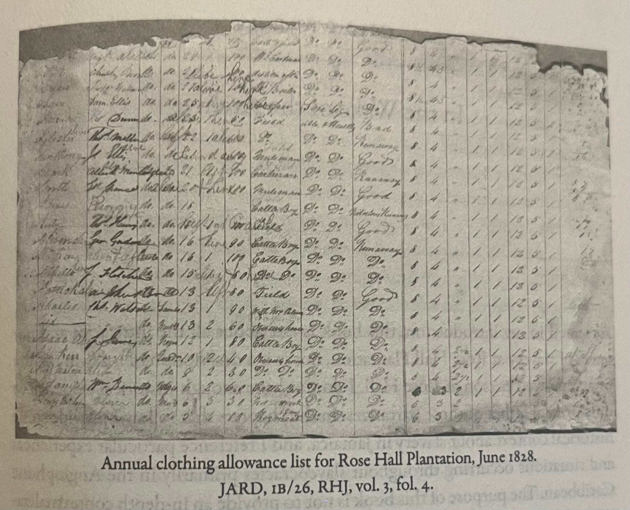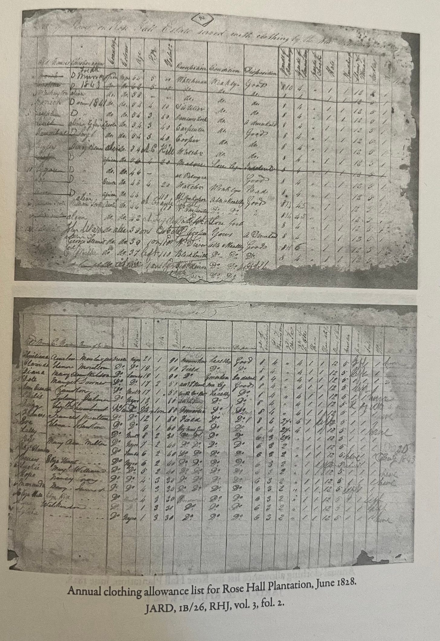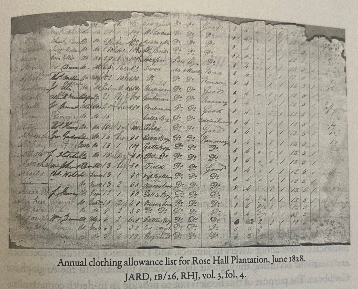 Annual disbursement and allocation of clothing, which was done once a year (requirement of the Consolidated Slave Law of 1788); One strong caveat: no shoes are included in the allocation, “as shoes were not deemed by enslavers as necessities for enslaved people at Rose Hall and other plantations across the Americas.”