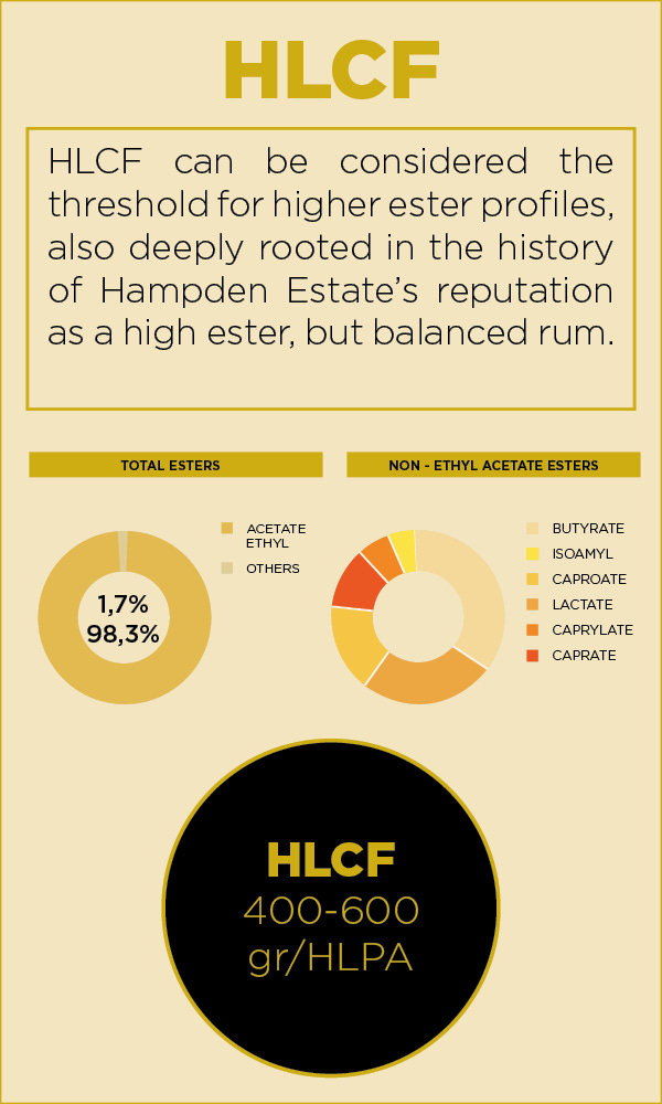 The esters are the result of the interaction between acids and alcohols during both fermentation and the distilling process. For Jamaican rums, it is the first fermentation phase which is determinant. Many esters generate aromas similar to those we perceive as fruit and flowers. Ethyl acetate is the lightest and most volatile. It is not especially aromatic but it always predominates, accounting for 90 to 98% of total esters and acting as a vector for other, more aromatic, esters. These esters - each one heftier than the next - bring floral and fruity notes such as green apple and pear and then more intense citrus, pineapple and banana flavors (brought by ethyl butyrate and isoamyl alcohol) characteristic of Hampden's historic marks. – Velier