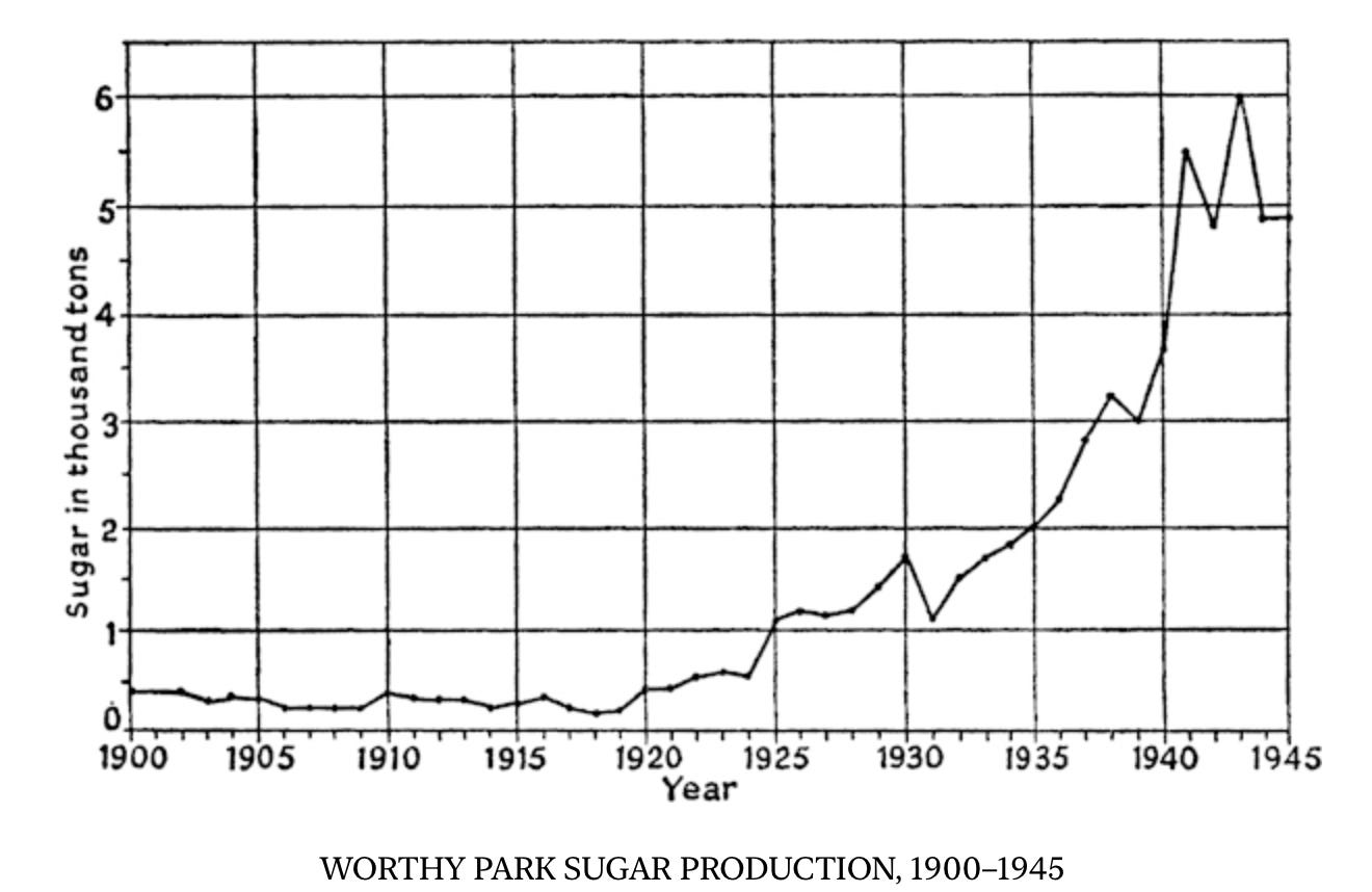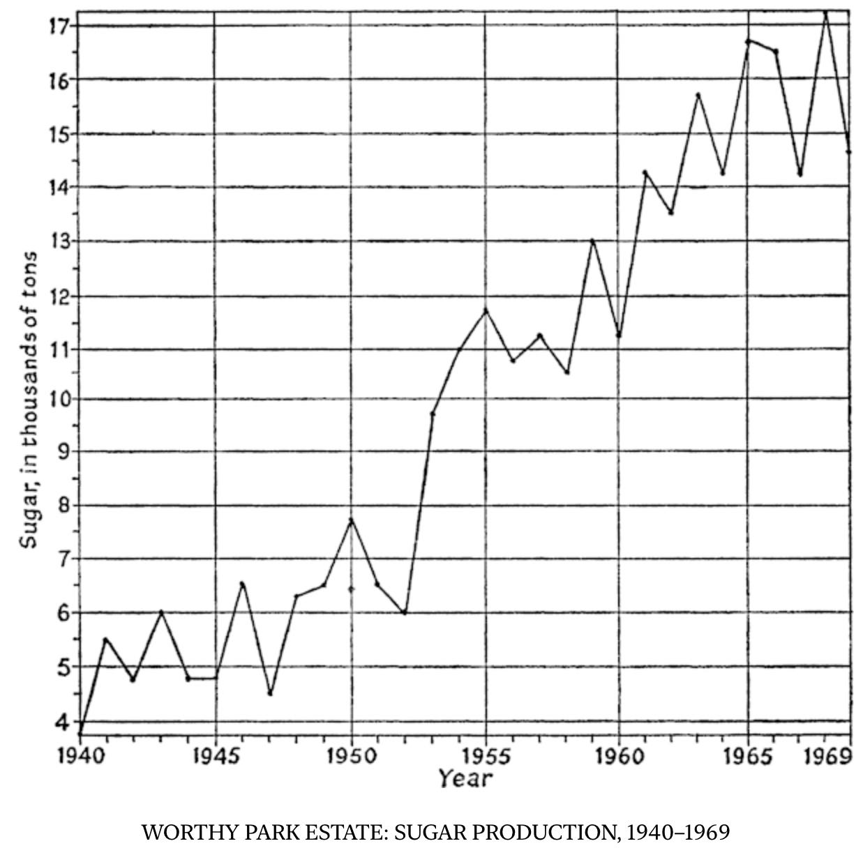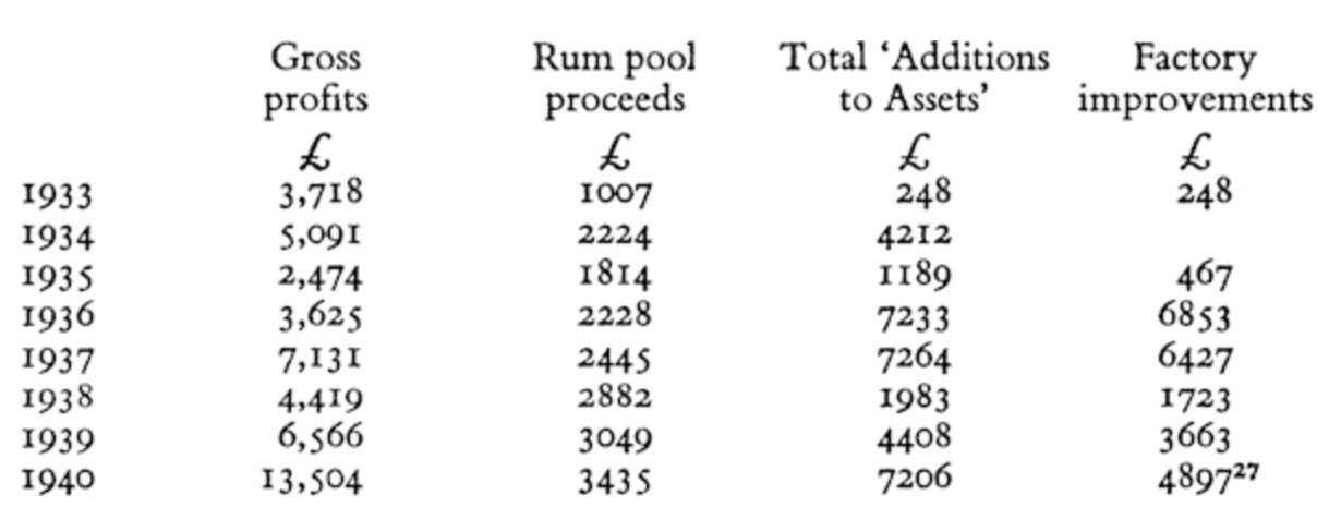 The “tremendous increase” in demand came into play as World War II began. Many producers globally (especially of European beet sugar) were, uh, occupied. The Clarke brothers were sure to take advantage of the market gap. Take a look at the sharp increase in Worthy Park sugar production between 1930 and 1940 –