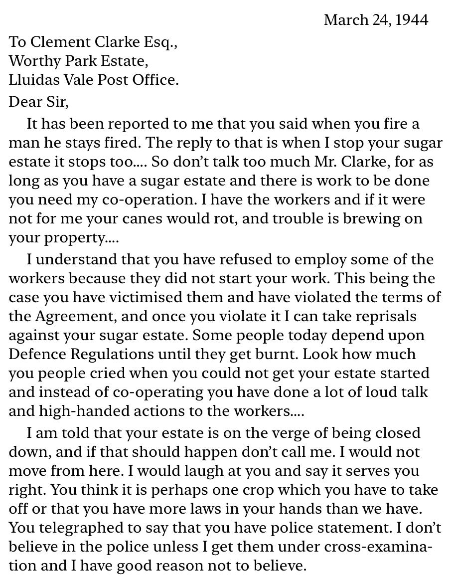 While Craton and Walvin conclude that, between the 1940s and 1970s, there were “largely unsuccessful attempts by the various unions to gain a monopoly at Worthy Park,” Bustamante did not take Worthy Park off his radar. Vitriol for Clement and Worthy Park was very clear on his part. A letter to Clement from Bustamante in March 1944 –