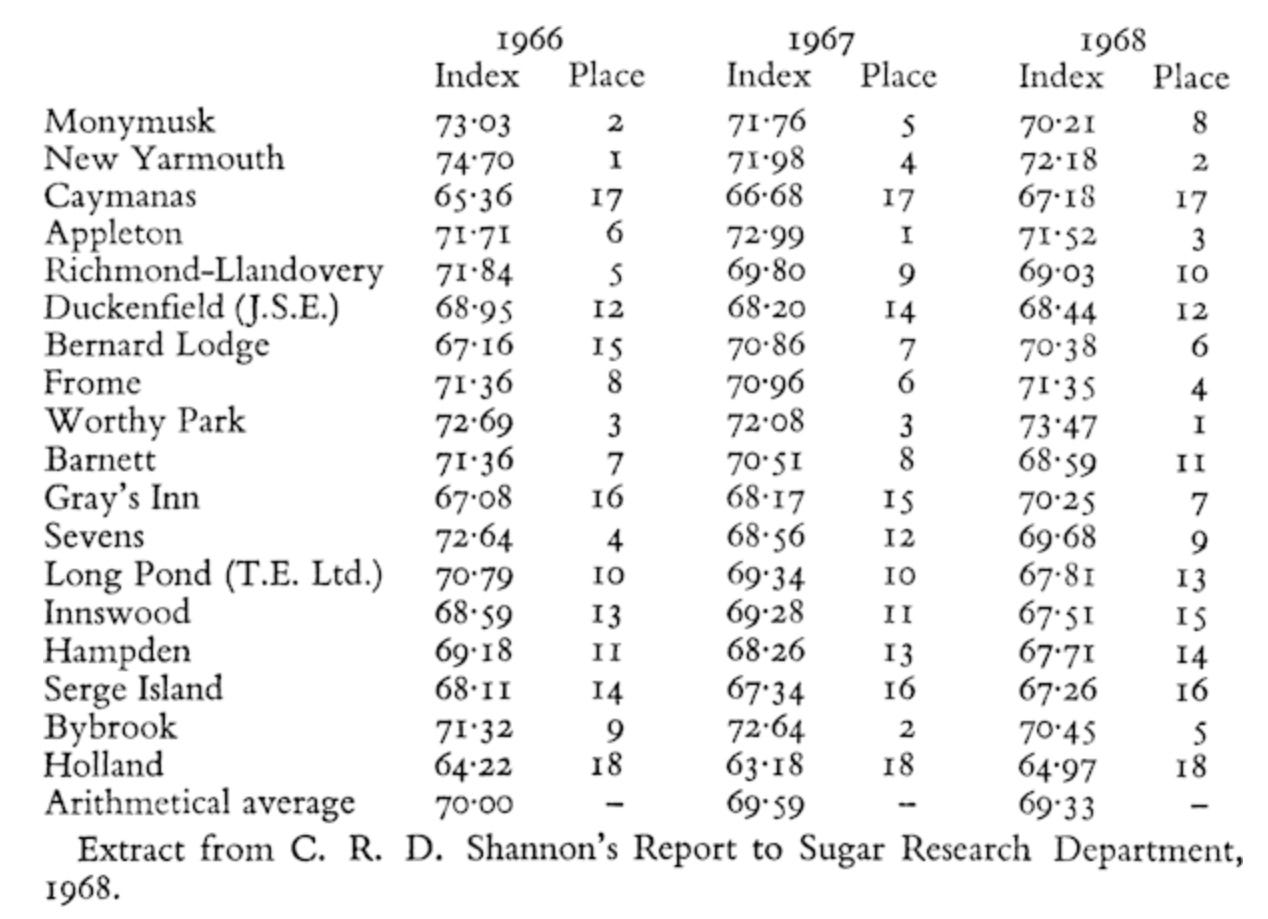 In overall efficiency, Worthy Park, for long one of the best of Jamaican estates, reached a position of absolute primacy in 1968, when the Research Department of the S.M.A. also reported that the estate’s record of producing sugar at a rate of 7·76 hundredweights per acre per month was ‘comparable with the best cane growing areas in the world’.”