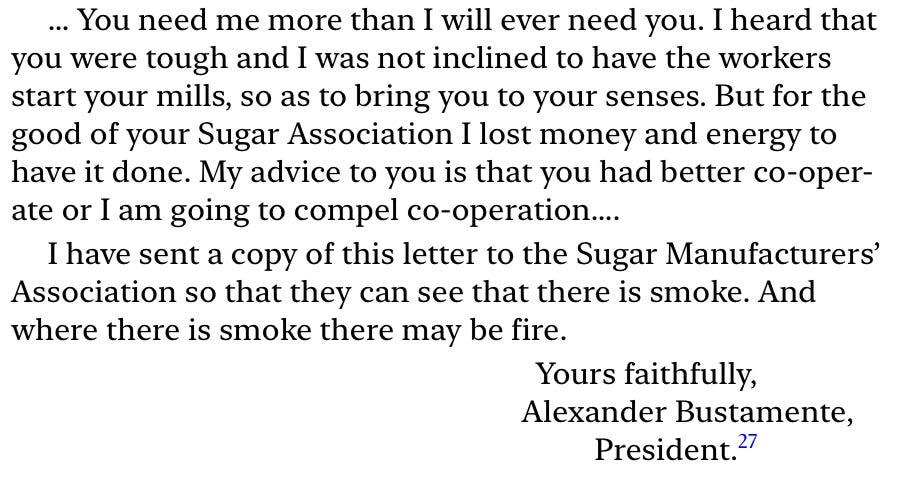It seems that Worthy Park was less impacted than the westernmost parishes of the island, though the rebellious fever was still palpable in a country but so big. Alexandre Bustamante, the man whose name you would have noticed in that newspaper clipping and who became Jamaica’s first prime minister, played a critical role in some of these worker-versus-aristocracy upheavals. He formed the Bustamante Industrial Trade Union (B.I.T.U.) to go after “corporation-owned estates” that he believed were “more easily unionized,” according to the authors, which is likely what spared Worthy Park the worst consequences of the riots.