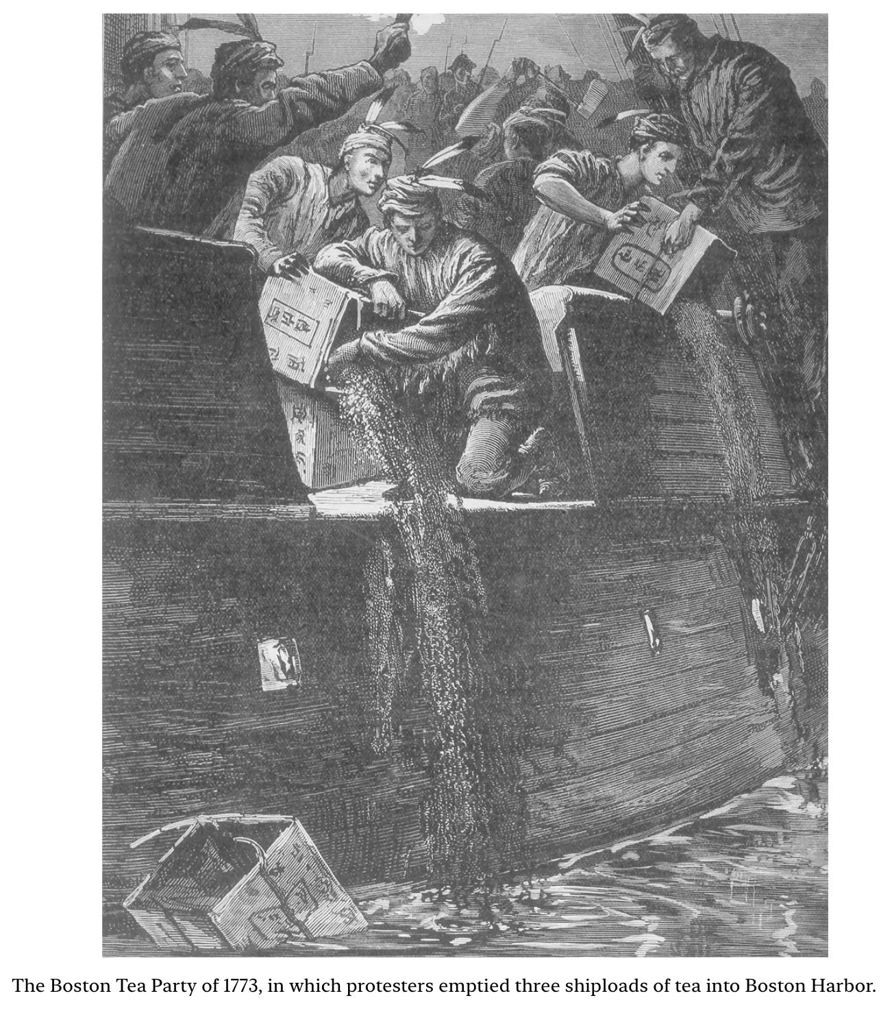 December 1773, tea was dumped into the Boston Harbor in protest. British sought compensation for their losses, implemented more “coercive acts,” and eventually, the mantra of “No Taxation Without Representation” came to a head and spiraled into the American Revolution. Remember, rum got this started =)