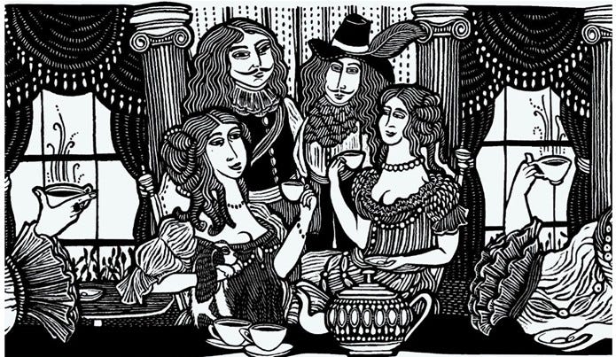 The Industrial Revolution minted new businesspeople, helped by the efforts of the British East India Company, especially in the services sector. Here is an example of original influencer marketing and the spark of consumerism (reminder that women and tea in Britain was not a happy accident; women’s attraction to the beverage was, in part, born out of exclusion from coffeehouses) –
