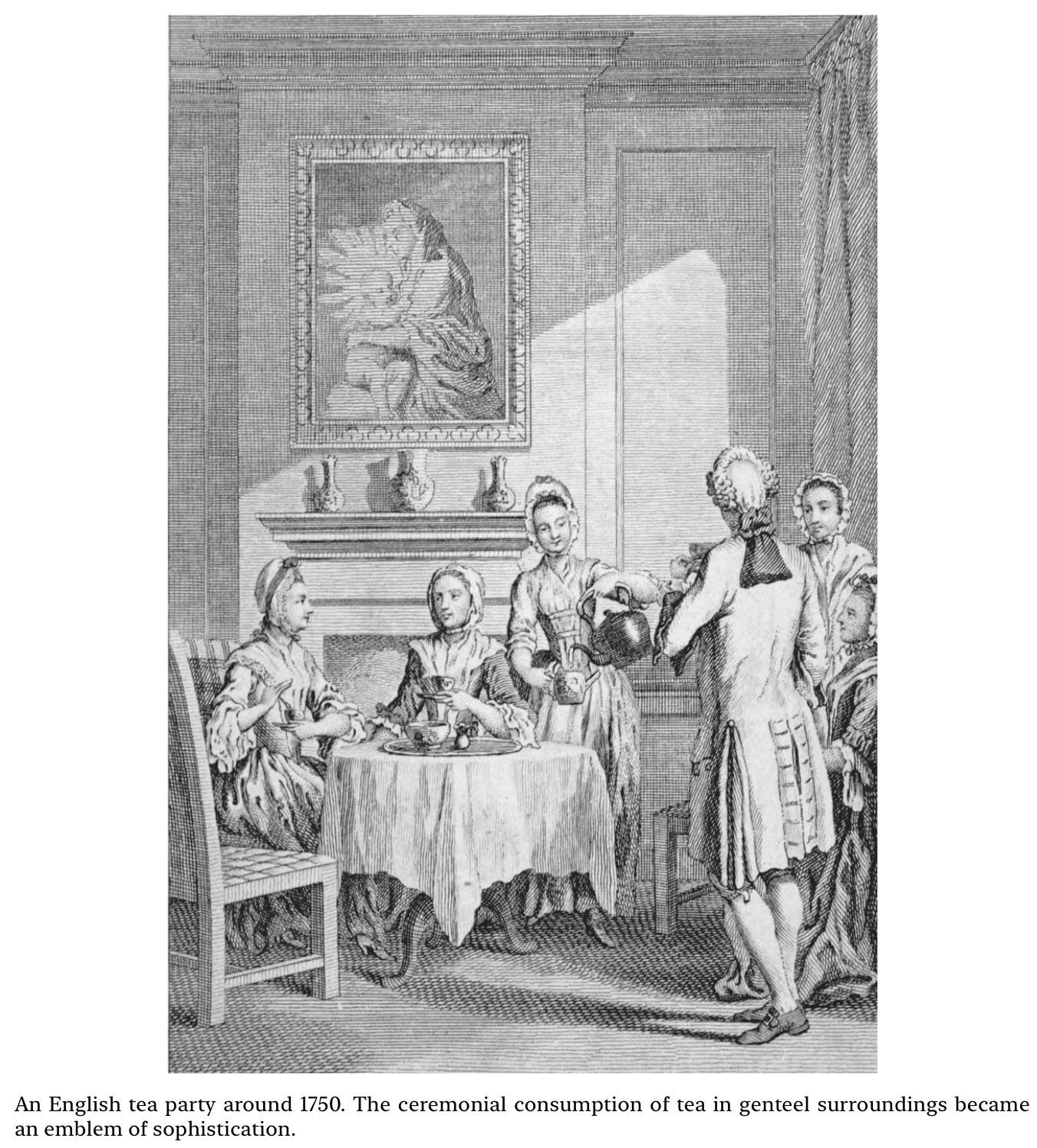 Linking these imperial and industrial expansions was a new drink—new to Europeans, at least—that became associated with the English and remains so to this day. Tea provided the basis for the widening of European trade with the East. Profits from its trade helped to fund the “advance into India of the British East India Company, the commercial organization that became Britain’s de facto colonial government in the East. Having started as a luxury drink, tea trickled down to become the beverage of the working man, the fuel for the workers who operated the new machine-powered factories. If the sun never set on the British Empire, it was perpetually teatime, somewhere at least.