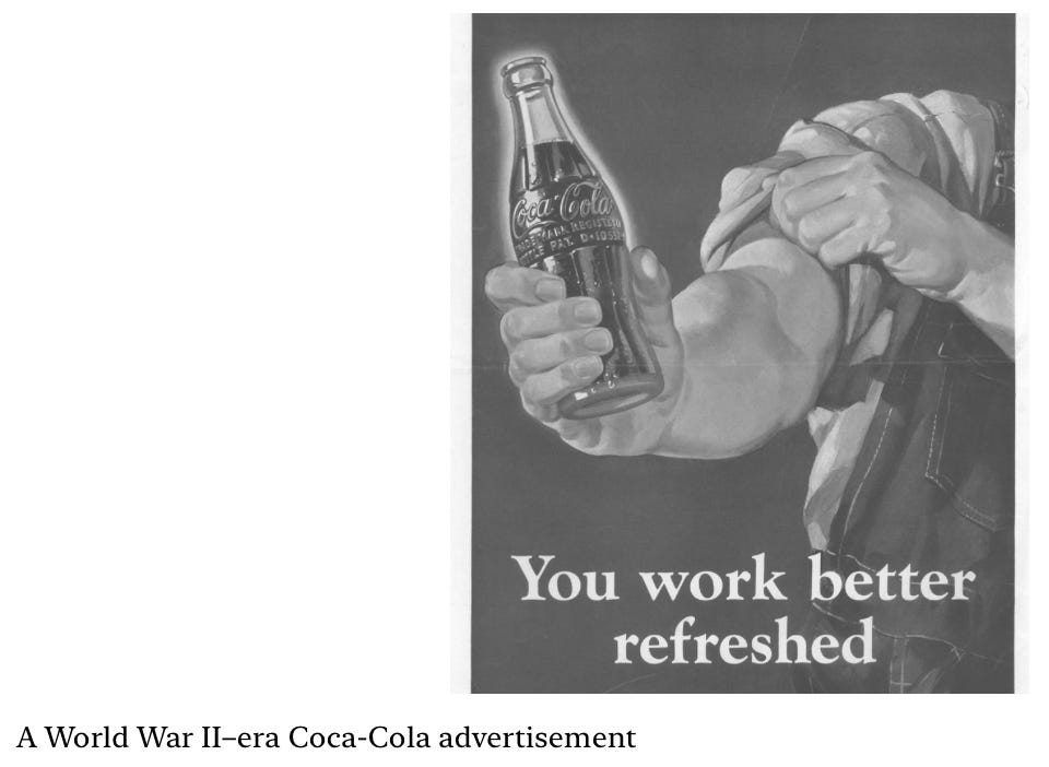 And here’s where things take a turn, from a cultural standpoint. Coca-Cola overtook coffee as the premier social/staple drink (in the U.S.) because it was deemed suitable for a) drinking at any point in the day and b) children/people of all ages. The drink – again, back to market/market-timing – flourished during Prohibition and the Great Depression, largely due to its “brilliant publicist, Archie Lee,” who was instrumental in Coca-Cola’s placement, marketing, and brand messaging.