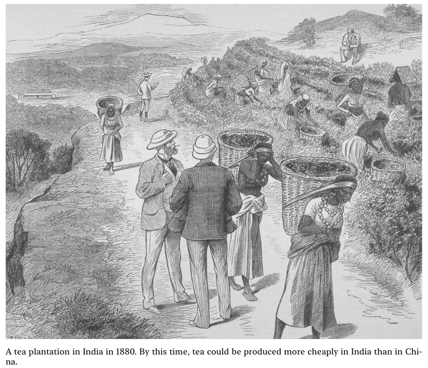 Fast forward – we know who the victors were – into the next century, the British East India Company shifted focus after losing its monopoly on the Chinese tea trade (the 1830s or so). They set their sites on India, whose economy the British played a role in decimating via the Industrial Revolution: cheaper, more “efficient” cloth making (England) vs. the artisans and hand-woven cloth of India. The weakened economy was then targeted by the British, who, using their knowledge of the tea trade/business, spurred by the British East India Company controlling and renting out lands to aspiring merchants (vs. doing the work themselves this time around), took over Indian tea plantations one by one. London merchants even created an enterprise called “Assam Company” to encourage “entrepreneurship” in the Indian tea cultivation and trade business. Note: Assam is a state in Northwestern India that is still well known for its tea farms. I think the British East India Company wanted to avoid another PR disaster – American Revolution – so they let others in on the business.